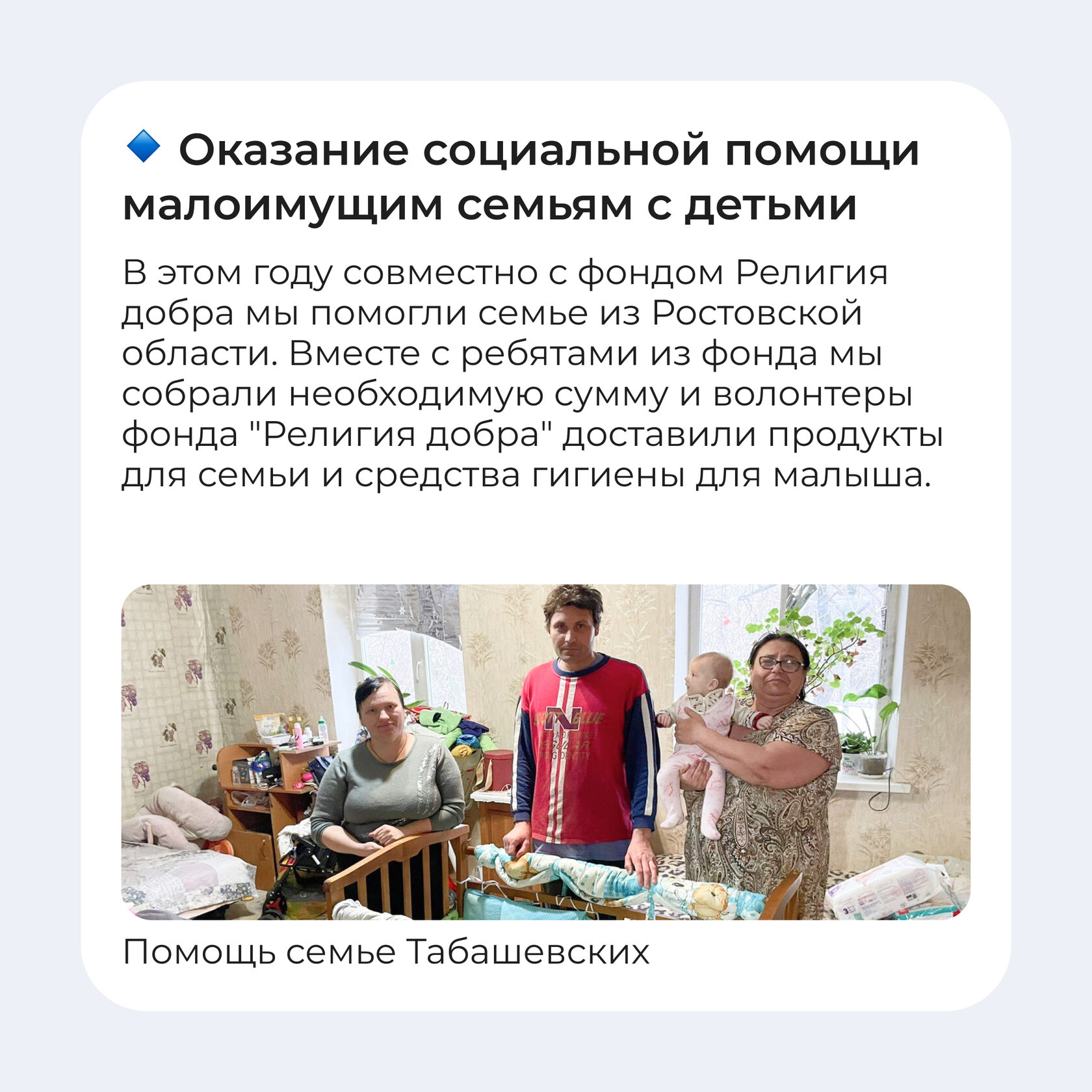 В этом году совместно с фондом Религия добра мы помогли семье из Ростовской области. Семья оказалась в трудной жизненной ситуации: низкий доход, муж Геннадий имеет инвалидность второй группы, в семье маленький ребенок (9 месяцев). Вместе с ребятами из фонда мы собрали необходимую сумму и волонтеры фонда "Религия добра" доставили продукты питания для семьи и средства гигиены для малыша прямо по адресу. История семьи Табашевских тут https://vk.com/wall-160955041_393.