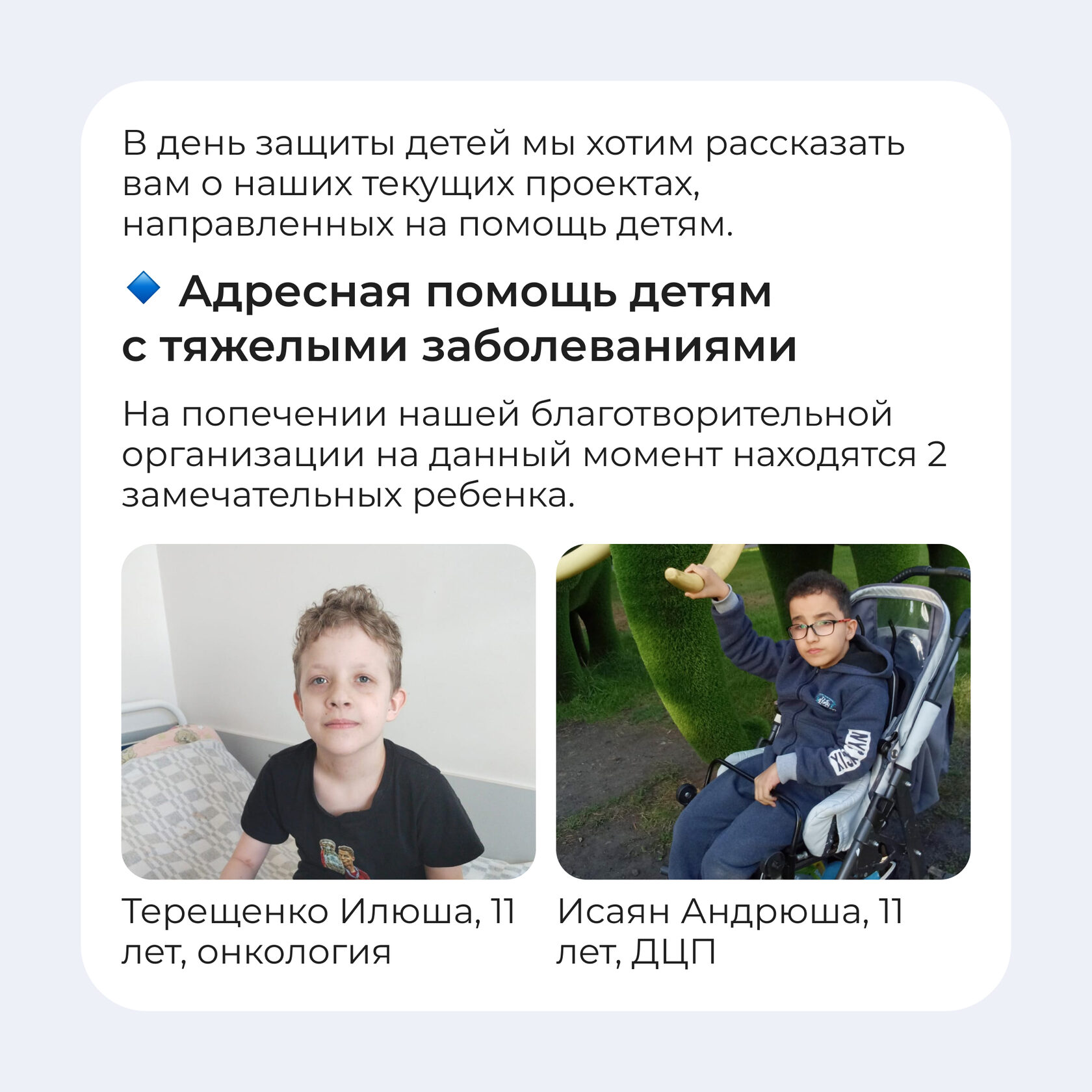 Мы хотим рассказать вам о наших текущих проектах, направленных на помощь детям: