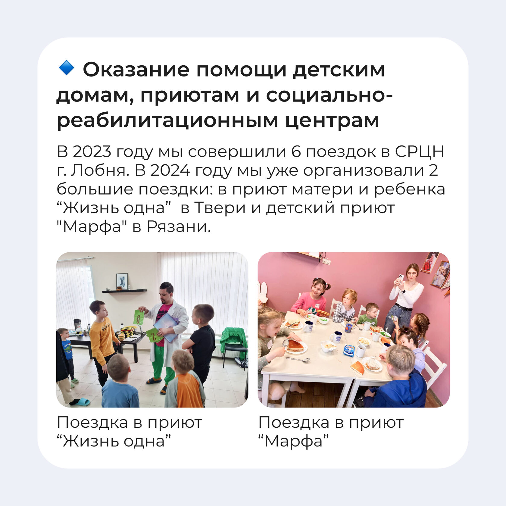 В течение года мы регулярно посещаем детей, оказавшихся в трудной жизненной ситуации, проводим развлекательные и просветительские мероприятия, дарим подарки, покупаем необходимые вещи и продукты питания и конечно, стараемся подарить каждому ребенку тепло общения и душевную близость. В 2023 году мы совершили 6 поездок в СРЦН г. Лобня. В 2024 году мы уже организовали 2 большие поездки: в приют матери и ребенка "Жизнь одна" в Твери (о поездке тут https://vk.com/wall-160955041_448) и детский приют "Марфа" в Рязани (о поездке тут https://vk.com/wall-160955041_474).