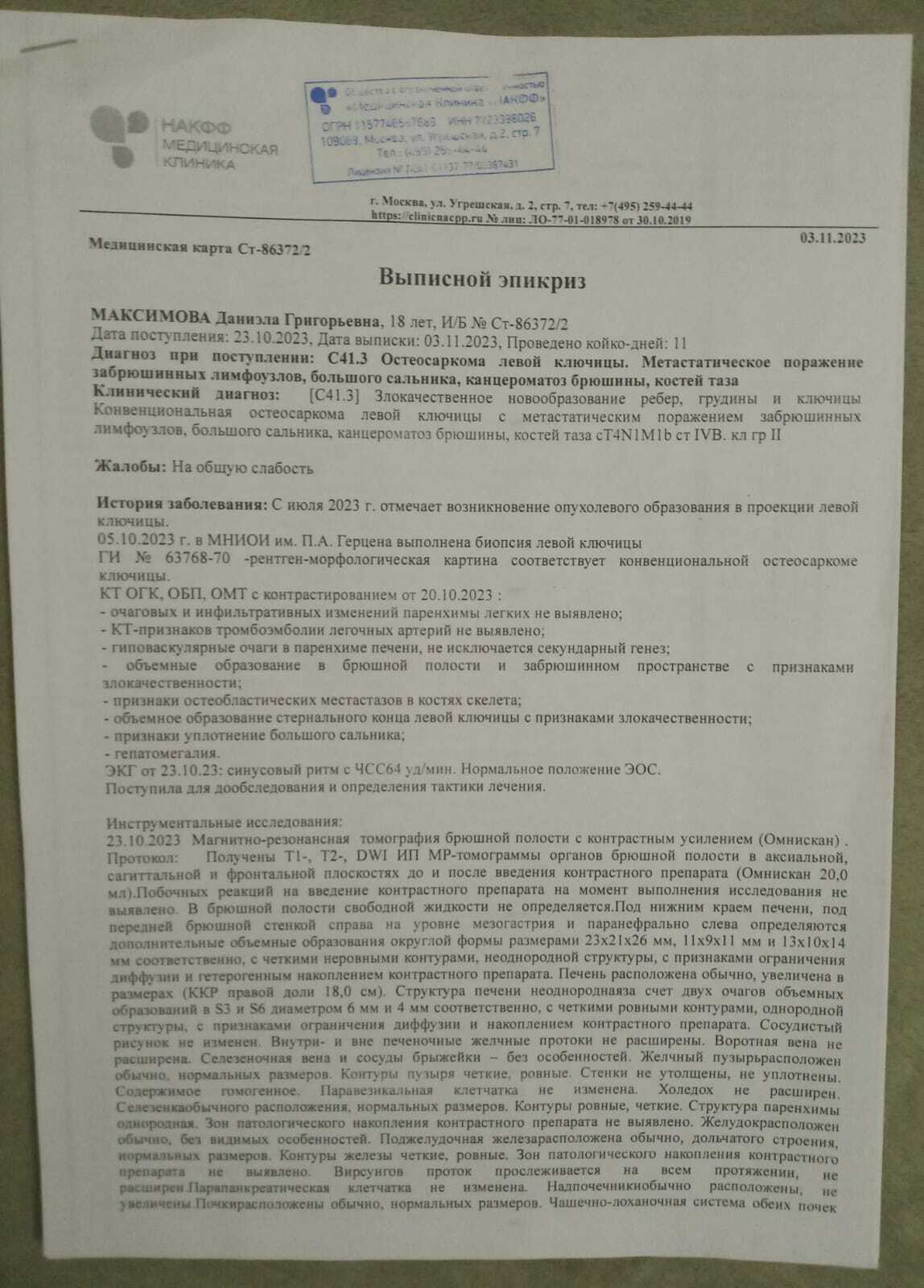 Хотим обратится ко всем неравнодушным людям за помощью. Девочка Даниэла 18 лет, ей поставили страшный диагноз «остеосаркома кости». Необходимо очень быстро лечить. Документы прикладываем.