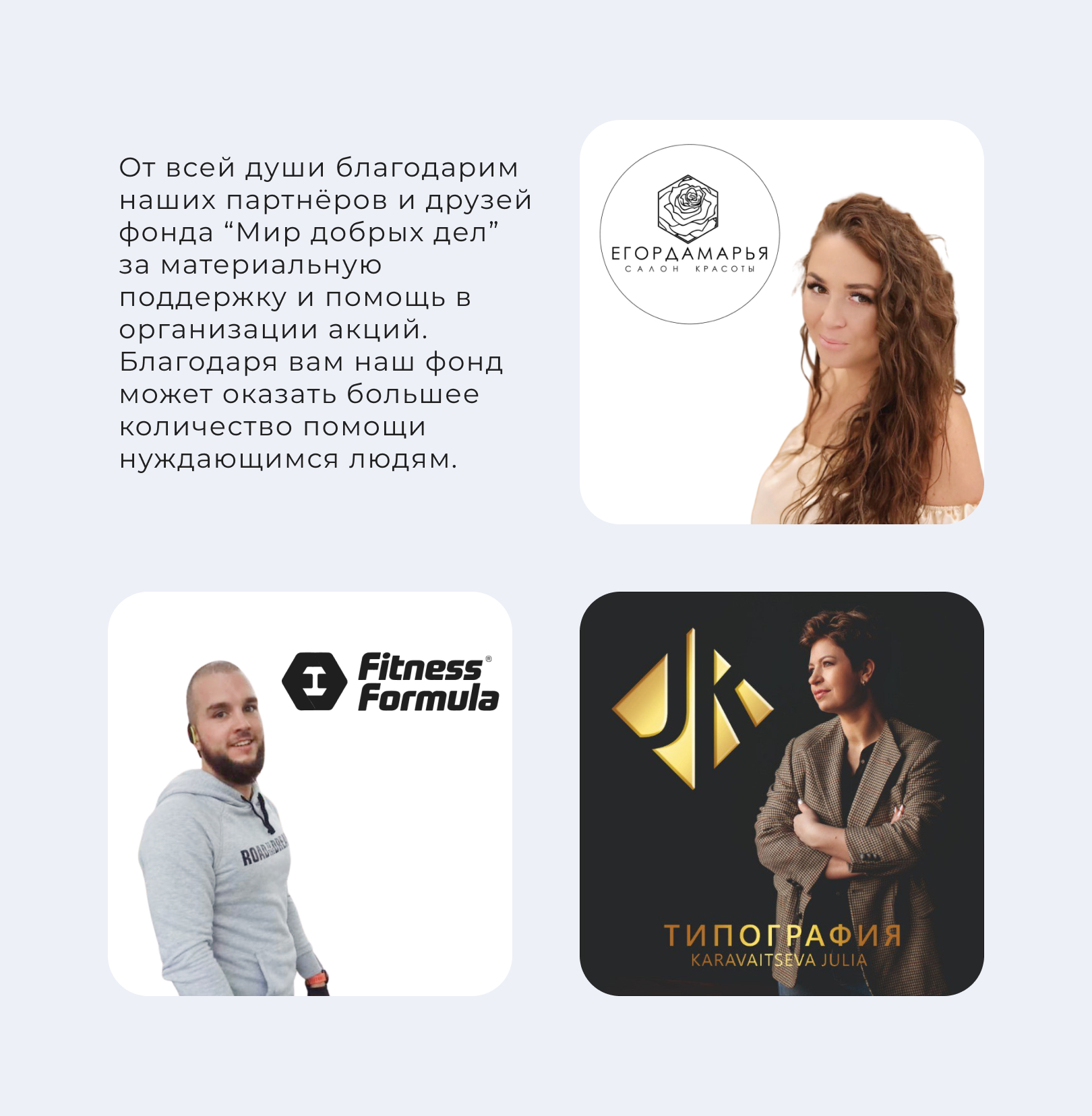 Спасибо за то, что вы помогаете нам продолжать наше важное дело в обществе. С вашей помощью мы можем сделать мир лучше.