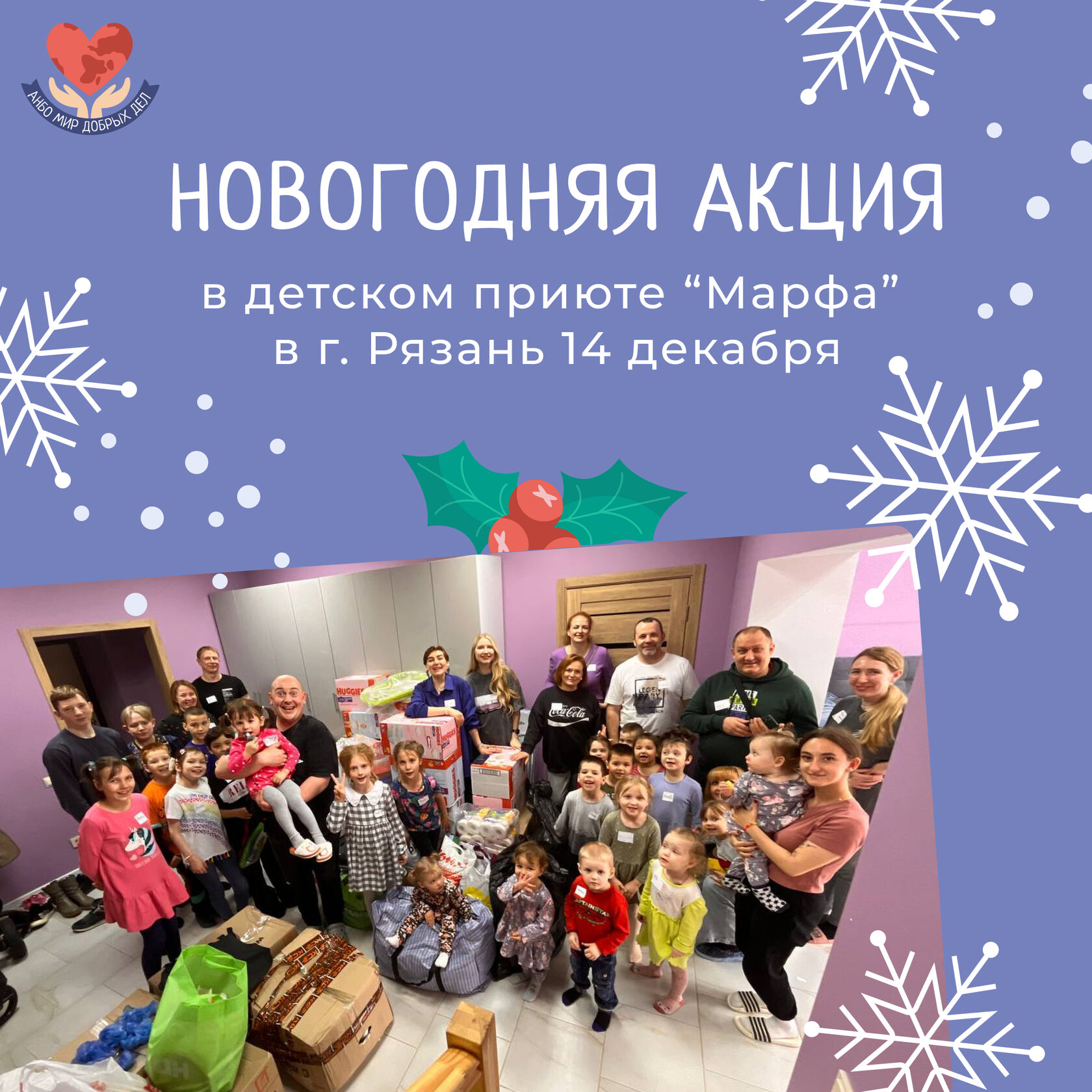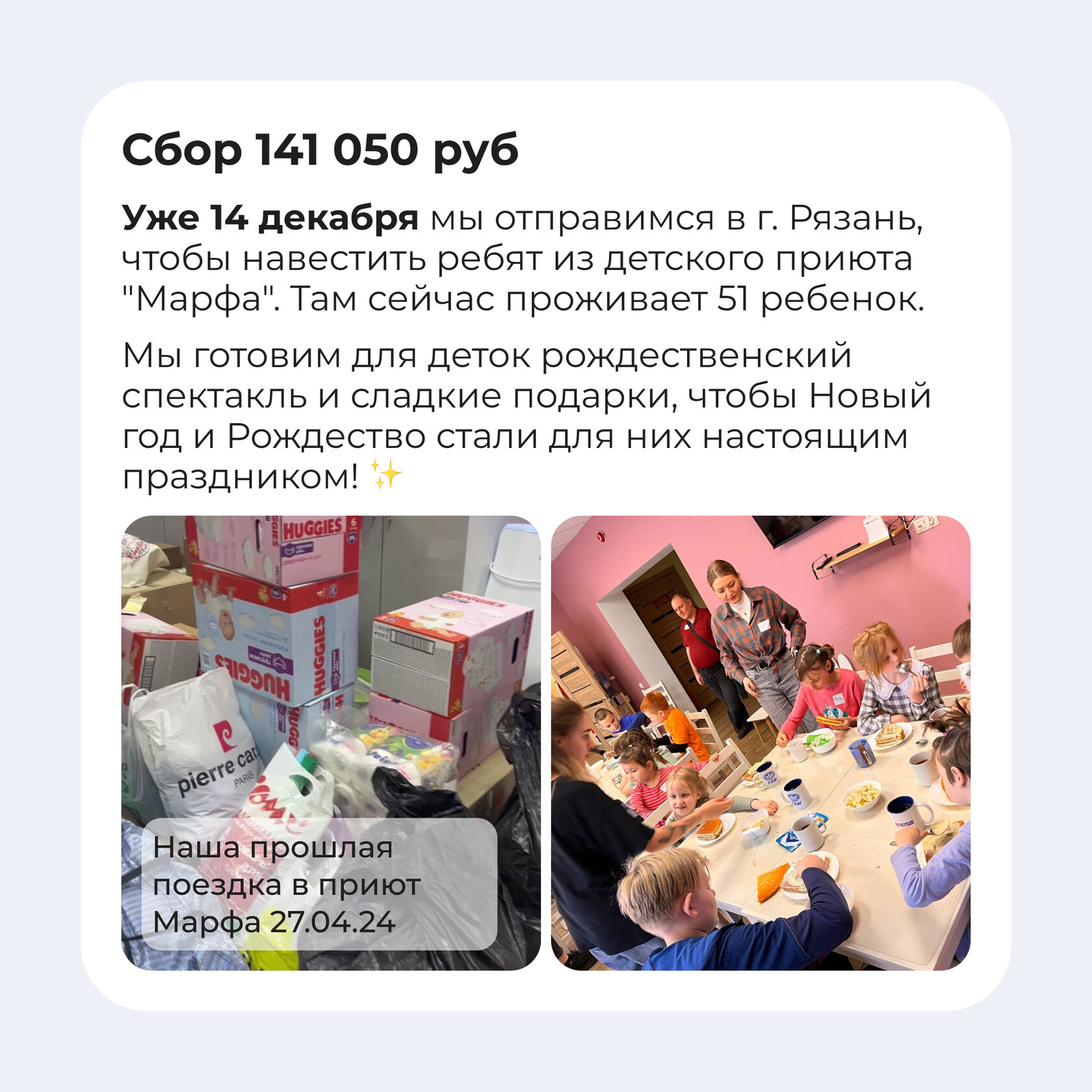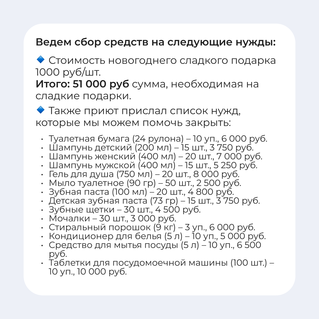 14 декабря 2024 года мы отправимся в г. Рязань, чтобы навестить ребят из детского приюта "Марфа". Там сейчас проживает 51 ребенок.
