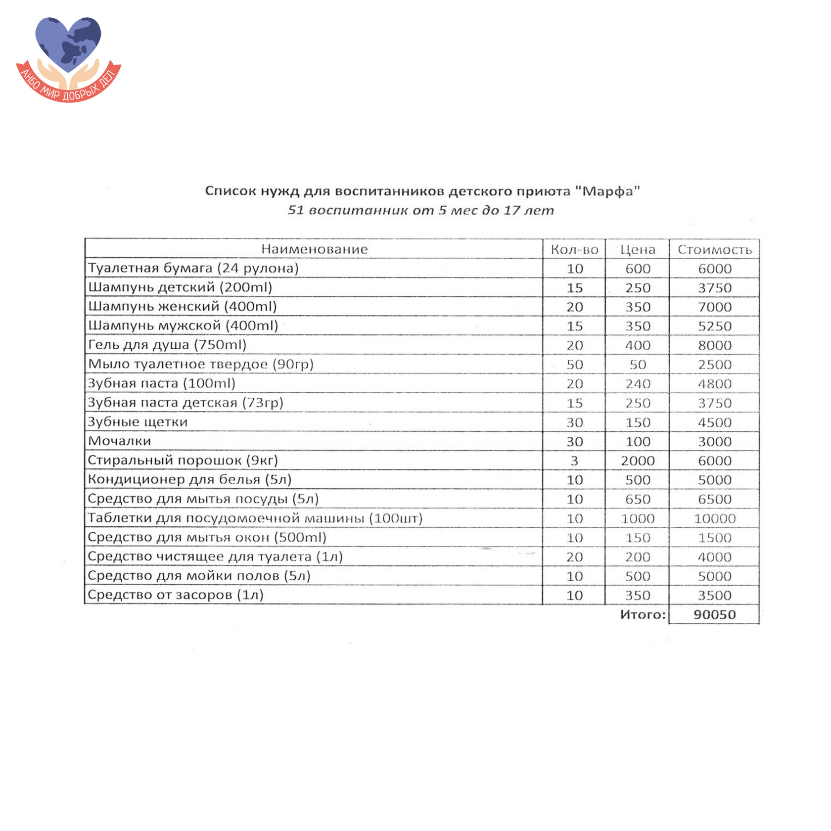 - Стиральный порошок (9 кг) – 3 уп., 6 000 руб.